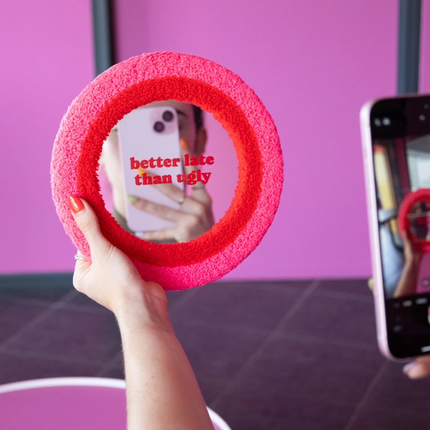 Miroir moumoute rose et rouge avec le message "Better Late Than Ugly" – parce que la ponctualité peut attendre quand on veut être impeccable ! Ce miroir original au design adorable apporte une touche d'humour et de modernité à ta déco. À accrocher au mur ou poser sur ta table, il ne passera inaperçu et fera sourire tous tes potes. Le cadeau idéal pour ta copine toujours en retard mais toujours stylée, ou pour tous ceux qui kiffe les pièces décoration uniques et décalées.